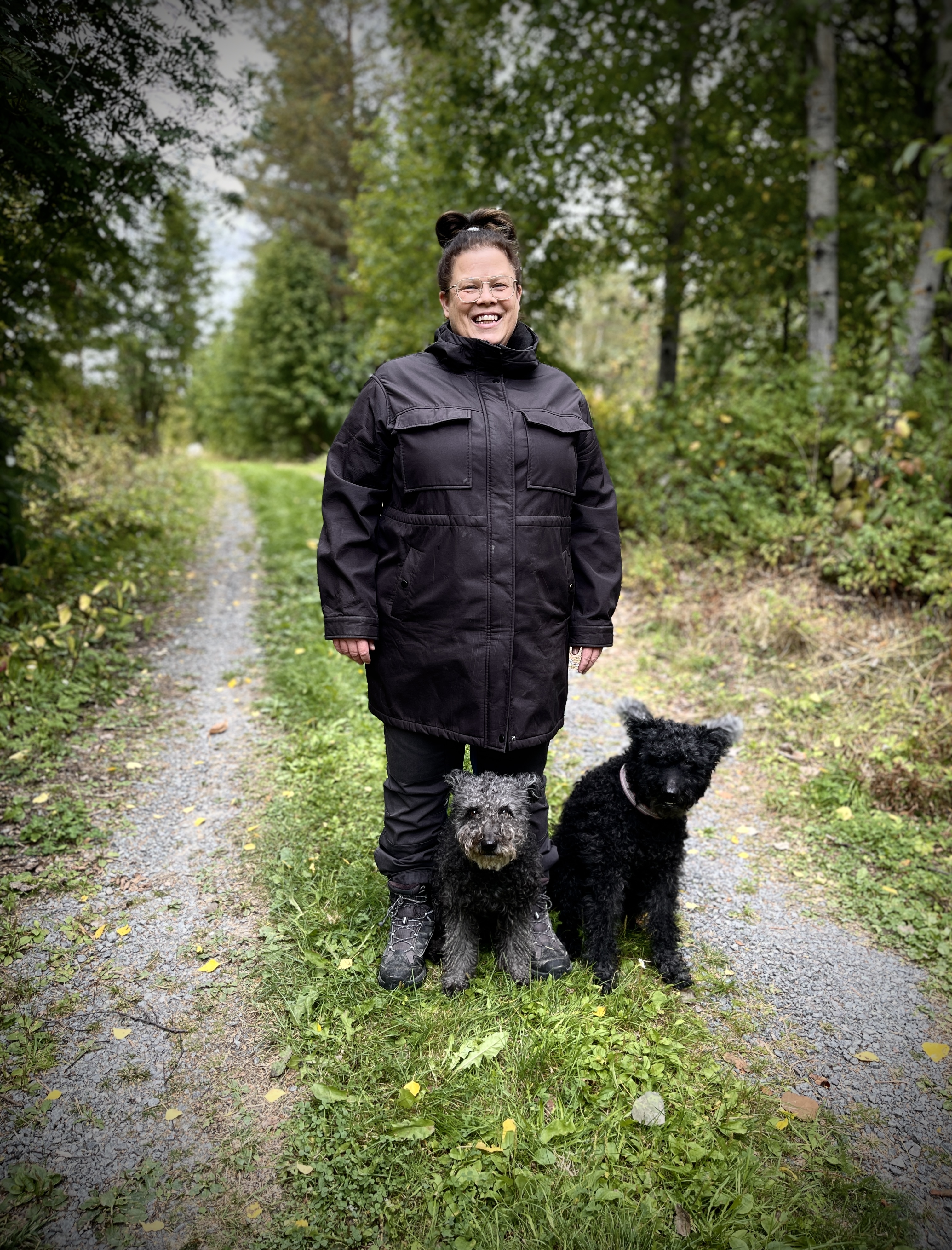 Äger två hundar av rasen Pumi, en hane på 9 år som heter Viktor och en tik på fyra år som heter Doris.